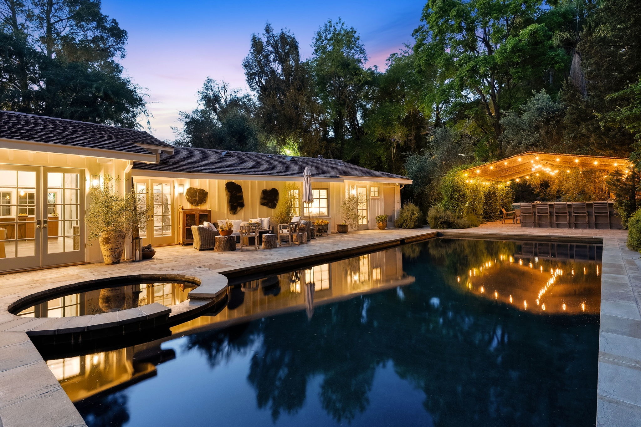 El Refugio, the inspiration, creation and home to an internationally acclaimed artist. Eight years ago, he had the vision to transform a raw, two-acre parcel at the top of Bel Air into a residential masterpiece reflecting the soul of the artist and his passion for beauty. The gated entry leads to a private compound with the single level main house, artist studio, guest house and meditation studio. Suitable for grand entertaining and casual gatherings alike, the home embraces its setting, opening to the pool and outdoor room with dining area, Barbeque, pizza oven, and fire pit. Meandering paths through lush landscape and cascading streams lead to private retreats, sculpted “moments” for reflection and meditation. El Refugio, a retreat, a refuge, Home.
